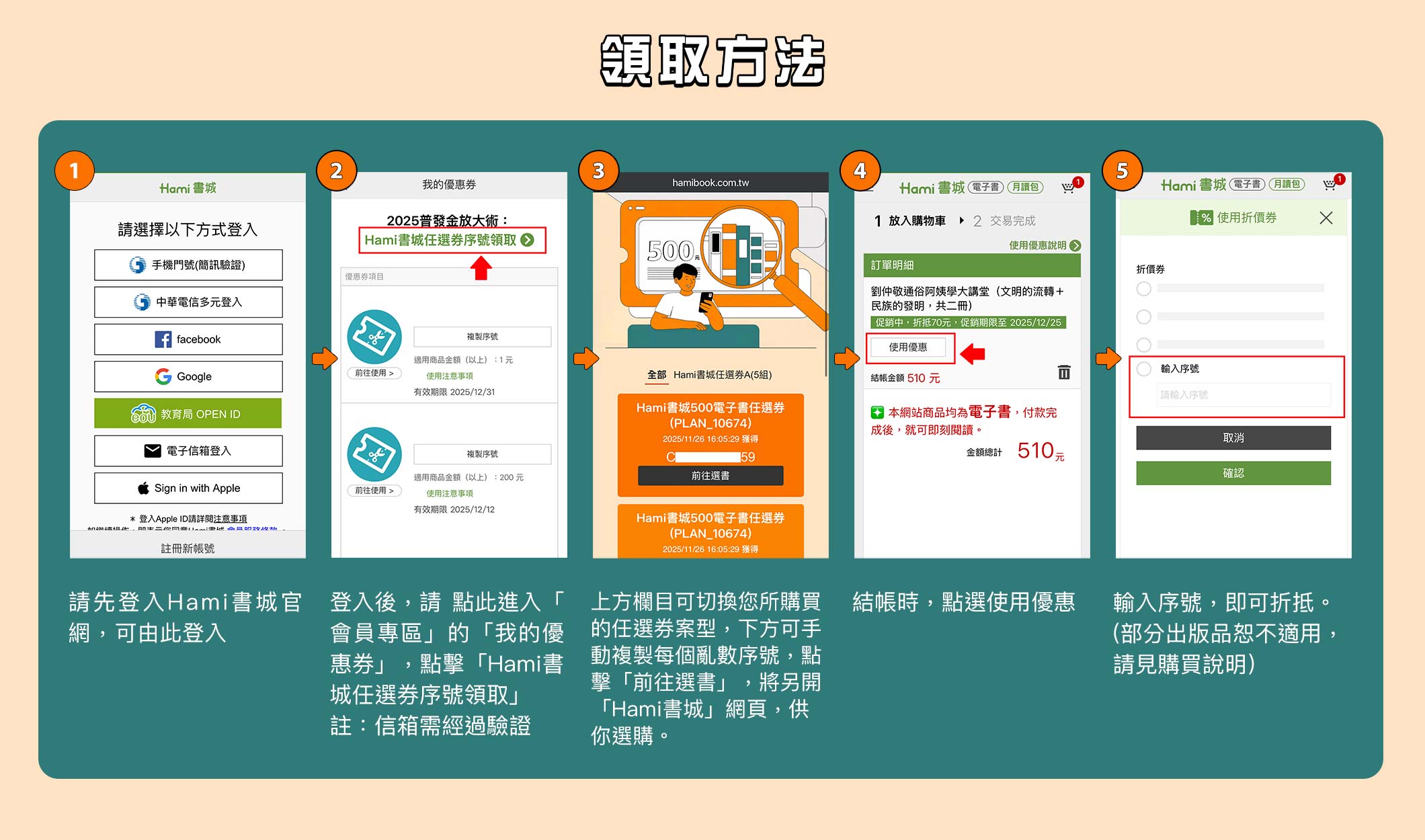 購買後,請於2025/11/21起登入Hami書城會員中心領取電子序號,可憑序號依購買方案,於Hami書城上任選兌換售價500元(含)以下之電子書刊,若書刊超過500元,亦可補差額進行兌換。每組序號僅限兌換一本書籍。