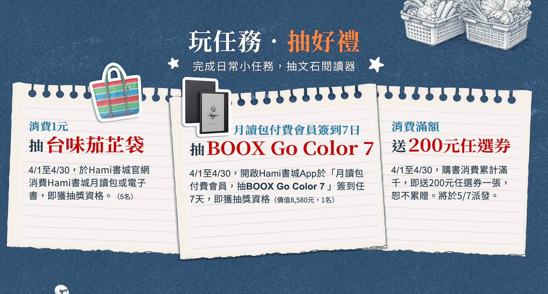 4/1至4/30期間,開啟Hami書城 App,並登入會員,點擊「好康」專區「月讀包付費會員,抽BOOX Go Color 7」簽到任七天,即獲抽獎資格。(本活動每人限參加一次,如重複參加者,主辦單位有權移除重複登錄資料)。
