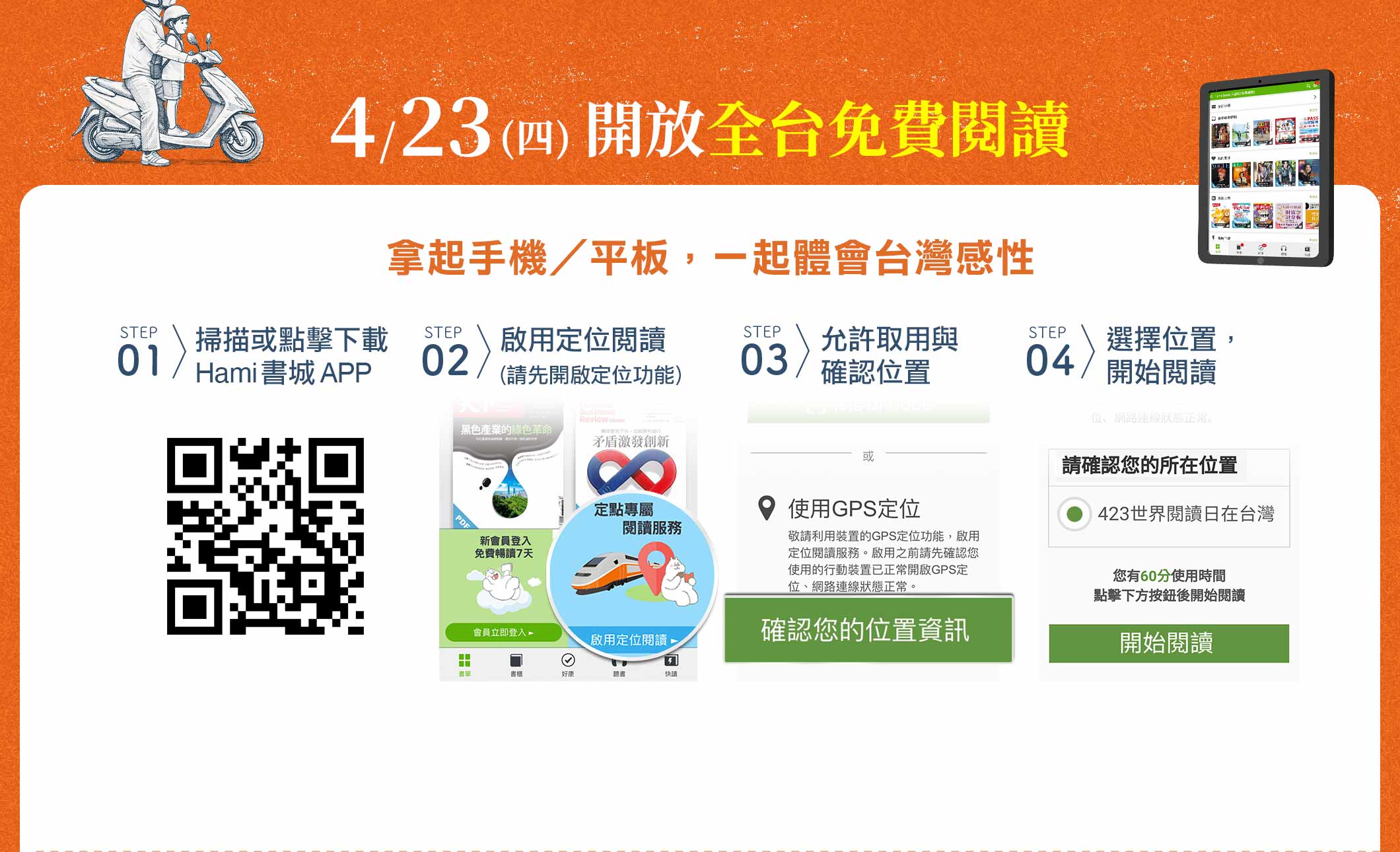 免費場域閱讀方式:為確認您的所在位置,打開Hamibook App後,請選擇「啟用定位閱讀」並允許Hami書城App存取位置資訊,點選「確認您的位置資訊」選擇「423世界閱讀日在台灣」後按下「開始閱讀」。即可進入「書單」暢讀月讀包內超過萬本架上書刊(每次啟用可閱讀60分鐘)