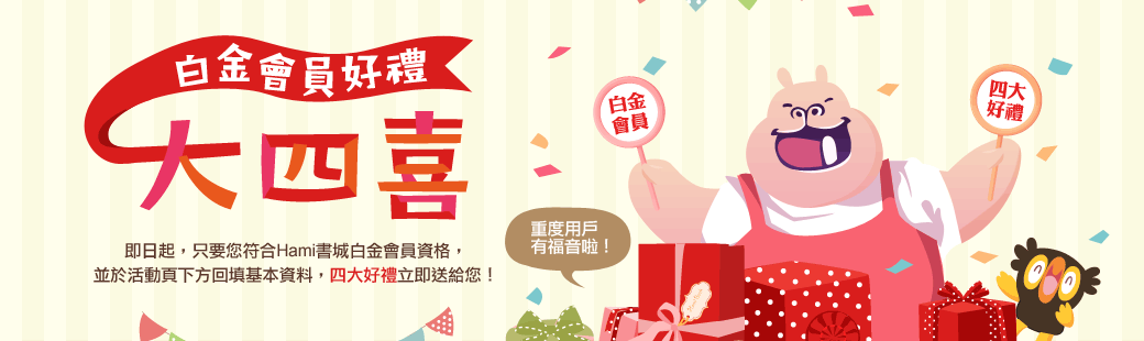 - 用戶領取活動好禮時須仍是中華電信Hami書城白金會員。本活動贈送之禮品將以簡訊寄送兌換序號,若用戶申請拒收企業簡訊服務,以致無法收到簡訊,主辦單位恕不負責。
