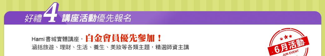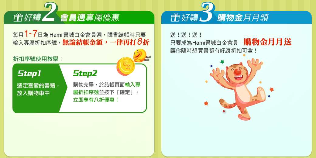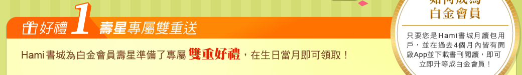 - 【Hami書城300元壽星購物金使用規範】壽星會員獲贈之300元生日禮金(三張100元),限於Hami書城內使用,單次消費折抵以一張為限,特殊商品恕不適用。生日禮金限當月領取,並限半年內有效。